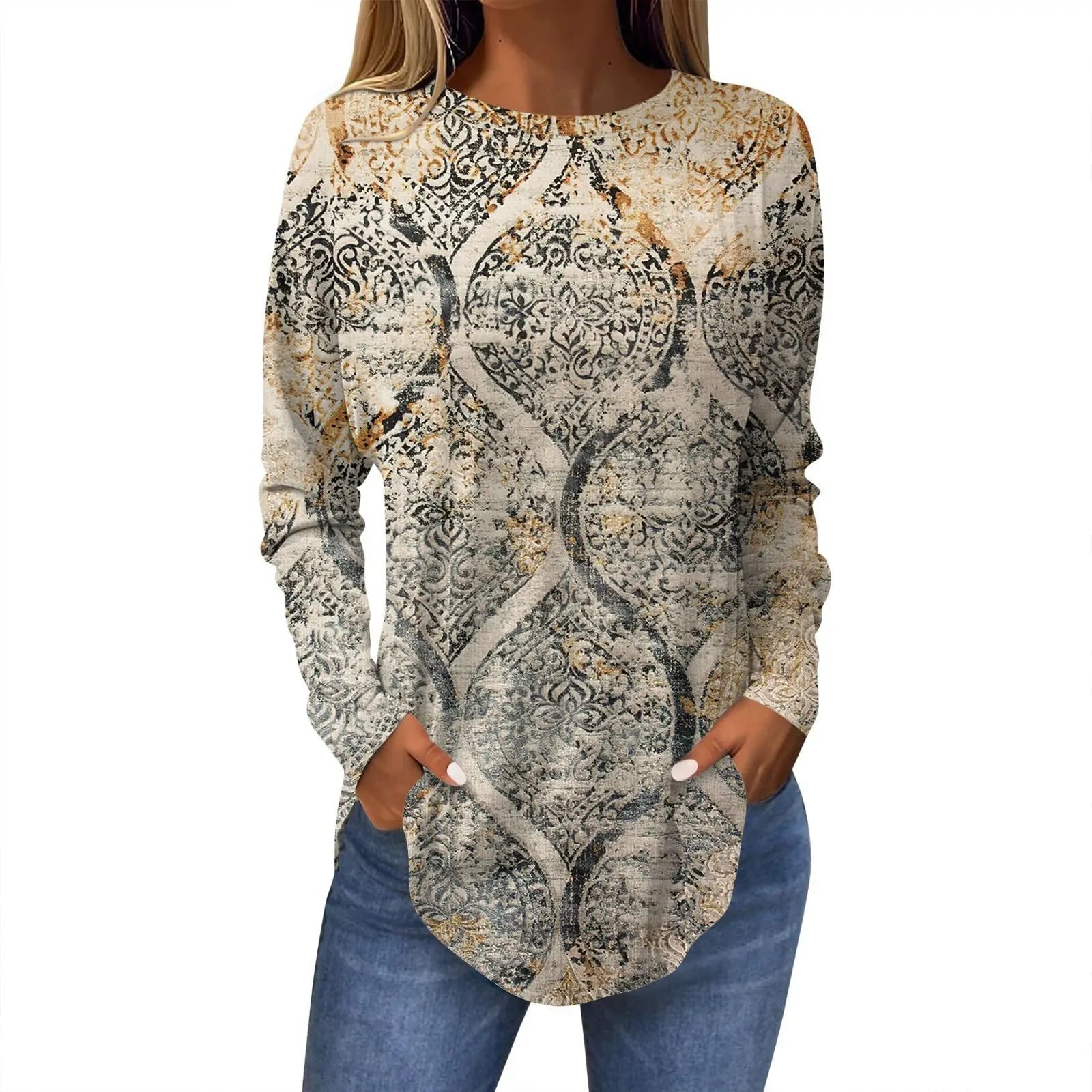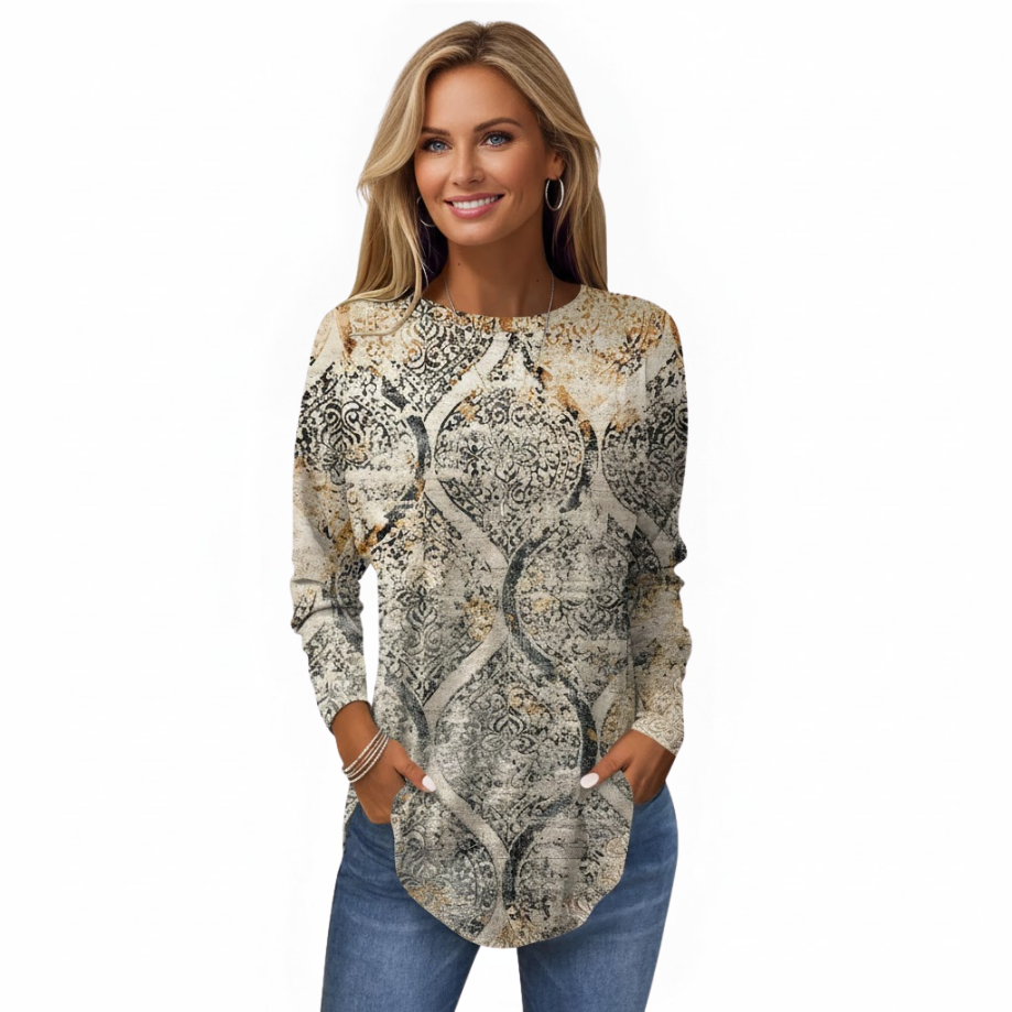 Această bluză cu mâneci lungi prezintă un model unic și original, care adaugă o notă artistică și sofisticată ținutei tale de zi cu zi. Țesătura moale oferă confort pe tot parcursul zilei. Perfectă de asortat cu blugi sau colanți, creează fără efort o ținută modernă și rafinată. O piesă versatilă, ideală pentru orice sezon.