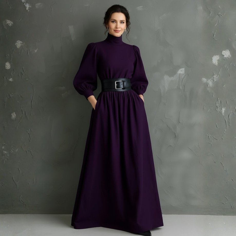 Această rochie lungă, elegantă și rafinată, în nuanța violet închis, prezintă un guler înalt sofisticat și o croială slim fit care pune superb în valoare silueta. Mânecele lungi adaugă un plus de eleganță și finețe, iar cureaua inclusă evidențiază talia, creând o siluetă suplă și sofisticată. Realizată într-o nuanță bogată de violet intens, rochia emană feminitate modernă și un farmec atemporal, fiind ideală atât pentru ocazii formale, cât și semi-formale.