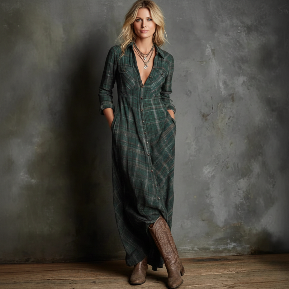 Rochia Sarah îmbină stilul chic casual cu eleganța clasică. Cu o închidere cu nasturi, guler și mâneci lungi, este ideală pentru tranziția de la zi la seară. Lungimea sa maxi fluidă aduce o sofisticare naturală, în timp ce modelul în carouri adaugă o notă de farmec modern.