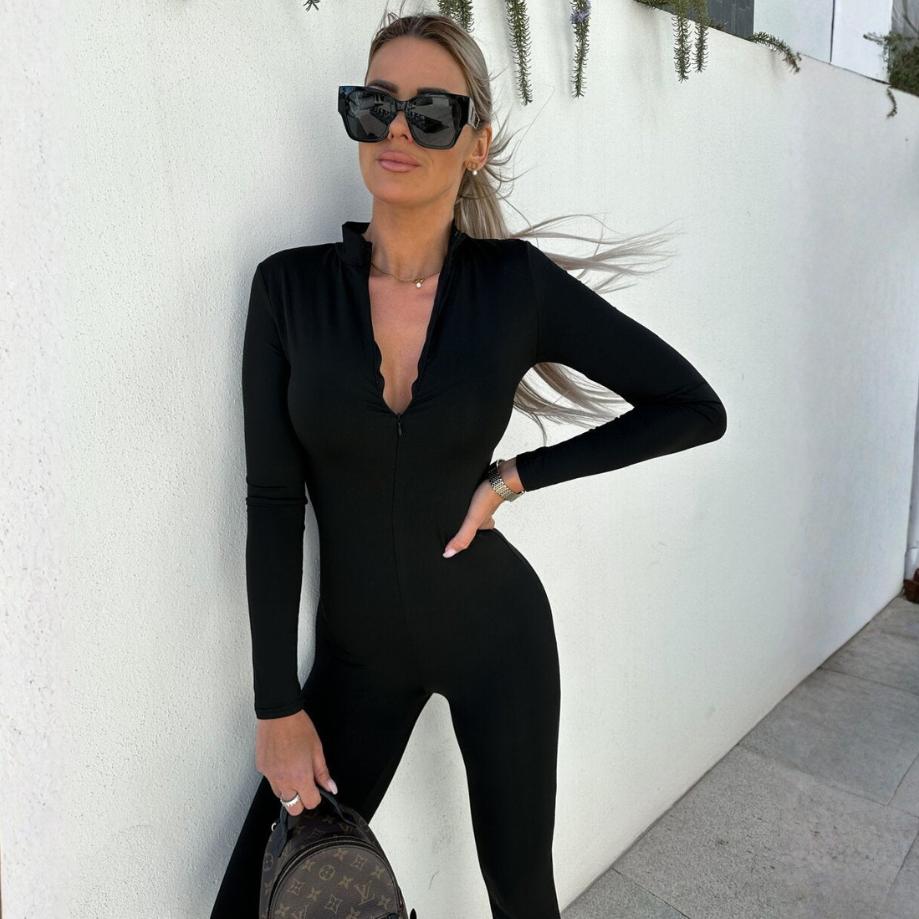 Intră în lumea unei eleganțe și forțe fără egal cu salopeta noastră elegantă, mulată, cusută manual. Salopeta cu decolteu pătrat este realizată din material elastic cu rețea, iar cea cu fermoar este dintr-un material neted și elastic, punând în valoare corpul tău într-un mod elegant. Cu mânecile lungi, fermoarul practic și designul versatil, este perfectă pentru orice ocazie.